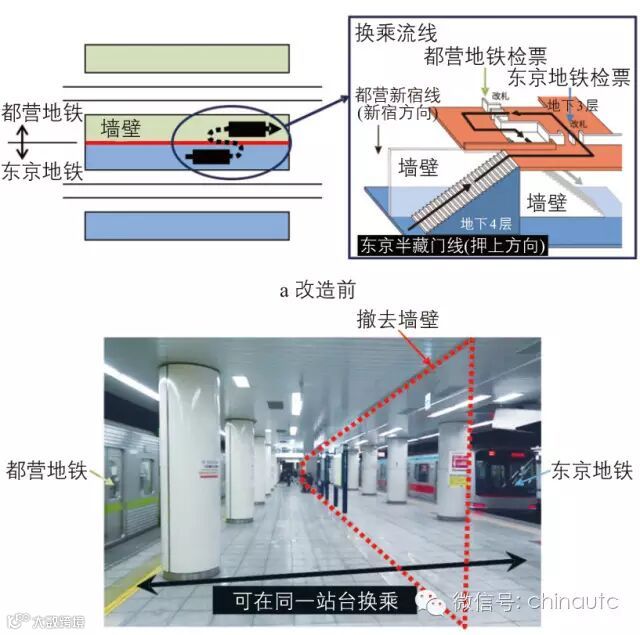 九段下站位于东京都市中心,是3条地铁线路的换乘站。该站的地铁线路主要由东京地铁公司和都营地铁公司运营。以往两家企业的票务相互独立,导致车站检票口分开设置。东京地铁公司的半藏门线和都营地铁公司的新宿线使用同一站台上下客,但在站台中间设置了隔墙,乘客换乘时必须再次到站厅检票,使得换乘极为不便。两家地铁公司通过商榷,统一了运费清算方式,并撤去站台隔墙,实现了客流同站台换乘,极大缩短换乘距离。九段下站改造前后的换乘效果对比如下图所示。