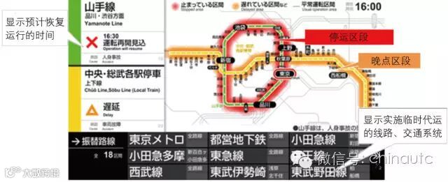 以东京都市圈为例,通过将所有轨道交通线路列车的晚点变更等信息进行共享,使各家轨道交通公司均可获得其他企业的列车运行信息。乘客在不同车站换乘前,可通过手机APP或换乘大厅显示板获取各类轨道交通列车晚点变更的信息,从而选择改变出行路径或换乘其他交通工具。东京都市圈轨道交通运行信息共享示意如下图所示。