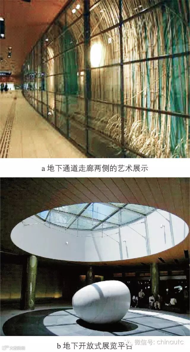 六本木站位于东京都主城区中心,是重新开发地区的地铁换乘站,该地区以各类商务中心集聚而闻名。地铁站厅与重新开发的东京中城以约200m长的地下通道衔接。为缓解乘客对换乘距离过长产生的焦虑感,六本木站将地下通道两侧墙面作为艺术展示空间进行有效利用(见下图)。