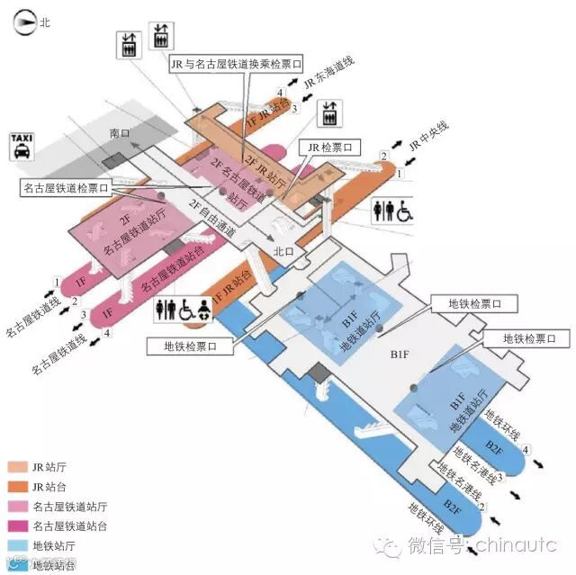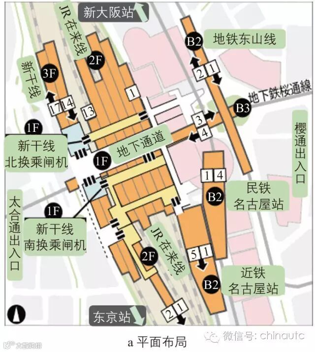 名古屋站作为名古屋市的对外交通枢纽,站内设置有新干线、JR线、民铁线、地铁线、长途客运总站和市内公交场站,是市内最大的综合交通枢纽。结合枢纽站房改造,名古屋站建设了超高层的车站大楼,其内部引进商务、商业、文化娱乐、宾馆酒店、美食街等城市功能,吸引了大量客流,同时促进了车站周边地区的发展。名古屋站平面布局和垂直空间功能布局如下图所示。