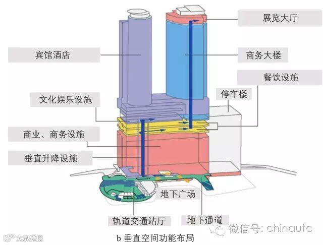 应考虑客流量大的流线,将城市功能布设于客运枢纽的交通设施之间以及客运枢纽与周边主要设施间。对枢纽进行立体开发是一种有效的办法,通过在枢纽内引进商业、商务和娱乐等设施,可实现枢纽交通功能与城市功能有机融合。