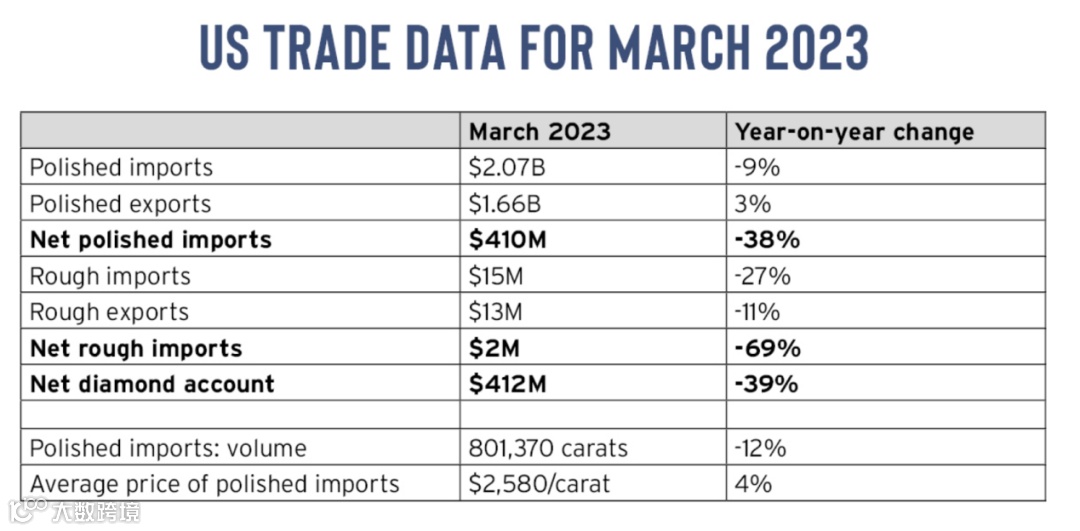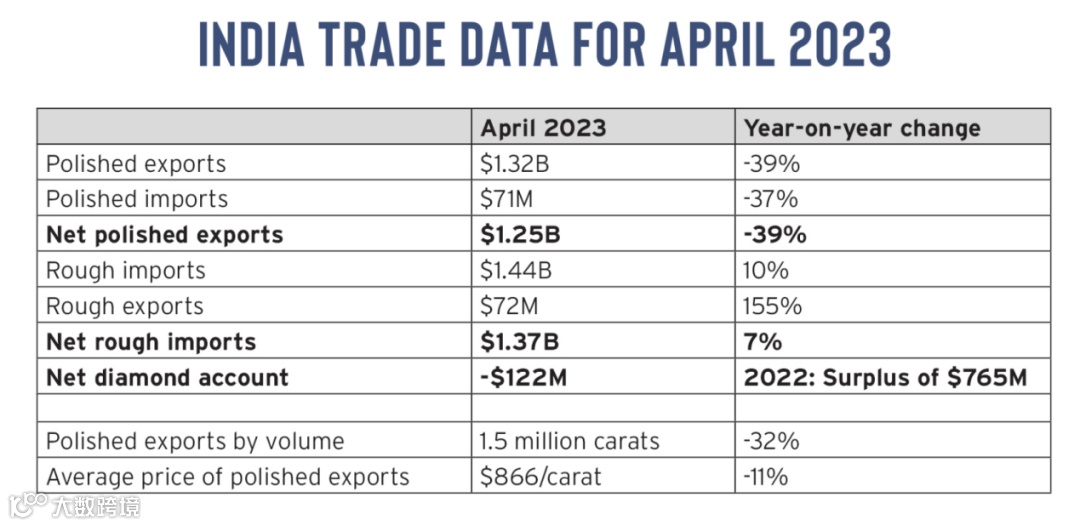 受美国和中国消费市场放缓影响,2023年前4个月中有3个月成品钻出口额下降。