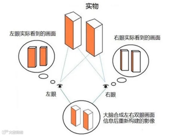 由于两眼水平分开,物体在左右眼视网膜成像,当双眼能同时看到物体时就具备了一级视功能——同时视;而后大脑将双眼看到的物体融合成一个完整的物象就形成了二级视功能——融合视;由于视角的差异,双眼所看到的物体会形成微小的不对应差别,即双眼视差,并由此产生三级视功能——立体视。