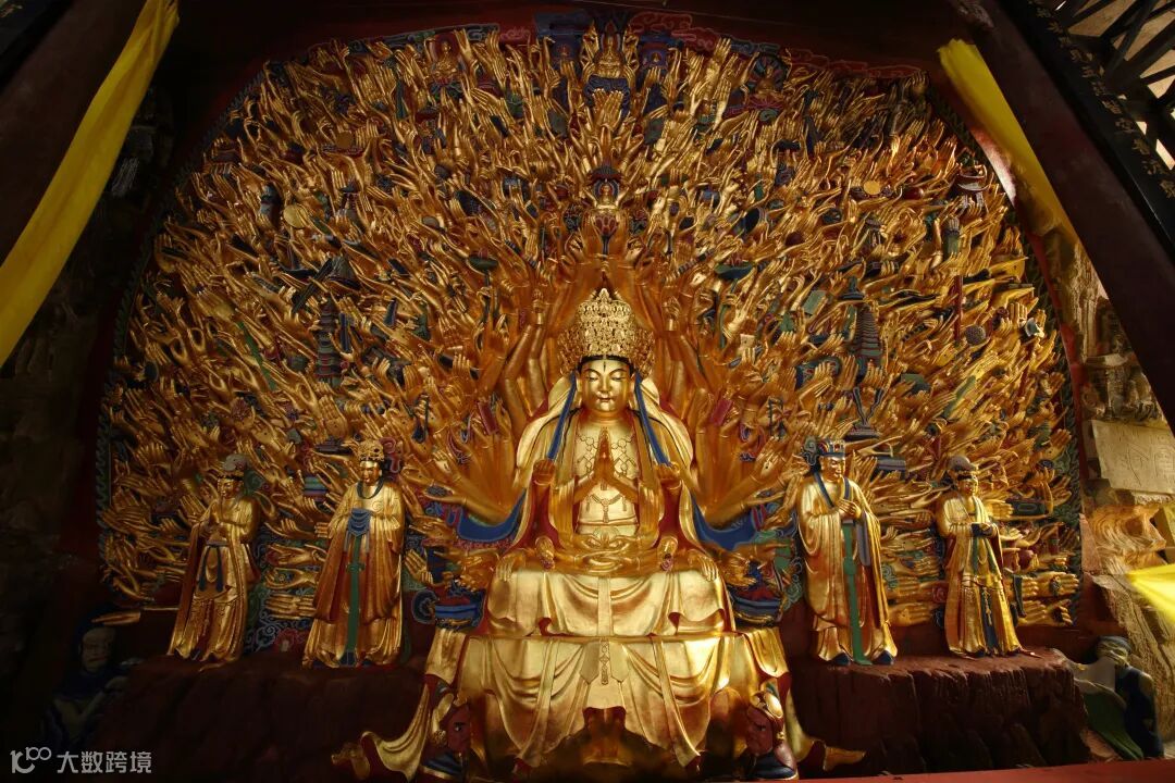 深受宋代人文气质影响,大足石刻色彩典雅明艳,服饰繁荣富贵,技法刚柔相济;佛像面相圆润清秀、细腻妩媚,形体上美而不妖、体端身直、姿态优美;菩萨宝冠雕饰华丽,璎珞垂珠翠,香环结宝明,披帛飘带轻拂飞扬,极富工艺装饰之美感;宝顶山千手观音,规模之宏大、工艺之精美、影响之深远,世所罕见。