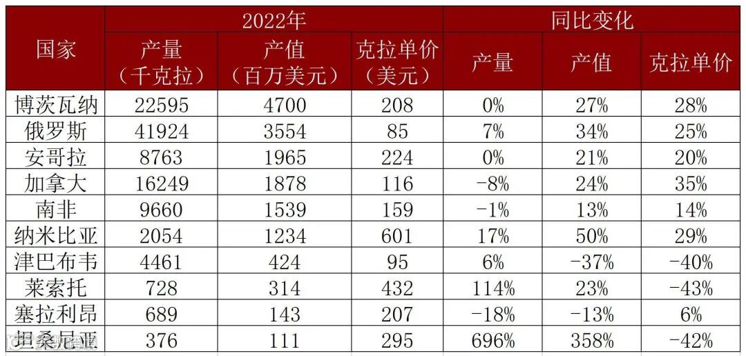 根据产量来看,2022年全球毛坯钻石产量同比下降1%至1.18亿克拉,其中坦桑尼亚和莱索托成为钻石产出增长较快的国家,前者产值同比增长358%至1.1亿美元。