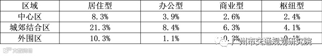 办公型和商业型站点在不同区域的特征具有一定相似型,如外围区的办公和商业型站点公交接驳比例均较低,而中心区的接驳比例约为城际结合区的一半左右。
