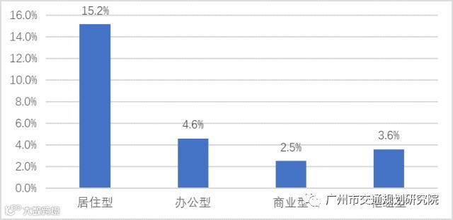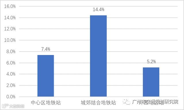 从站点周边主导用地属性聚类分析结果来看,居住型地铁站点的换乘接驳比例高达15.2%,办公型及商业型地铁站大多分布在中心区,其换乘接驳比例相对较低,另外枢纽型地铁站点如广州火车站、机场南站等地铁站点与常规公交换乘接驳比例也处于较低水平。