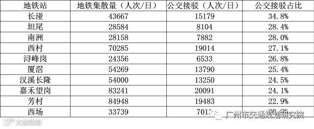 城郊结合区具有更高的接驳比例,而中心区居住型站点接驳比例相对较低。举例而言,五羊邨站位于中心区,站点周边公交设施发达,地铁与常规公交可达性较高,地铁与常规公交接驳的需求不高,其公交接驳比例为6.8%;而西村站位于城郊结合区,其公交接驳比例高达27.1%,主要接驳客流主要来自于站点西北方向的罗冲围、松洲、鹅掌坦、同德围等地区,该区域由于京广铁路的阻隔,东向西道路不完善,只能由南北向道路承担集散功能,而西村站是南北向走廊内最近的地铁站,常规公交接驳地铁需求强烈。