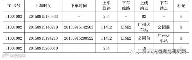 目前,广州市单日公交IC卡刷卡数据约467万条,地铁站点进出闸刷卡数据335万条。两类数据具有共同属性IC卡号,以该属性为关联指标进行关联匹配,可以整合得到基于IC卡的常规公交与地铁全出行链信息,下表为某IC卡的关联信息示例。
