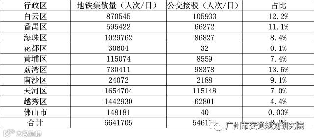 按行政区来看,由于白云区和番禺区紧邻广州环城高速,荔湾的芳村地区位于广佛交界地带,三区是近几年广州主城区人口疏散的主要地区,与广州最主要中心的直线距离均在10km左右,且上述区域现状轨道均成线性布局(未成网状格局),常规公交换乘诉求旺盛,换乘比例达到10%以上,成熟的越秀区和天河区由于轨道基本成网,且覆盖率相对较好,常规公交接驳比例相对较低。