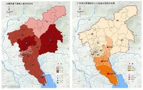 图5大震烈度下避护人口空间分布图 图6风暴潮受灾人口规模及空间分布图