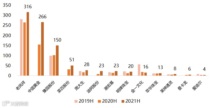 A股珠宝上市公司终端网点数量(注:部分上市公司半年报中未披露最新网点数据;豫园股份数据仅为“老庙”及“亚一”品牌门店数据)