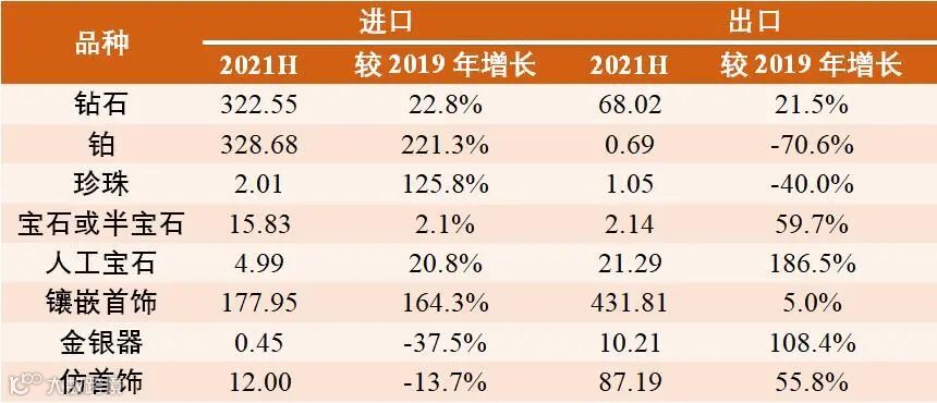 出口方面,因印度、越南、泰国等珠宝供应链基地受疫情影响产能不足,大量珠宝首饰生产加工订单回流至国内,人工宝石、金银器、镶嵌首饰、仿首饰等品类出口额较疫情前均出现显著增长。