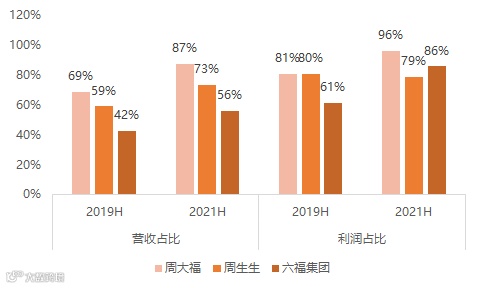 周大福、周生生、六福集团今年上半财年与疫情前同期内地市场业绩贡献率对比