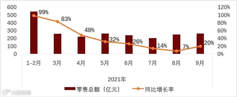 2021年前三季度金银珠宝类商品社会零售总额数据走势