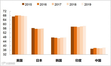 2015-2019年各国居民消费率