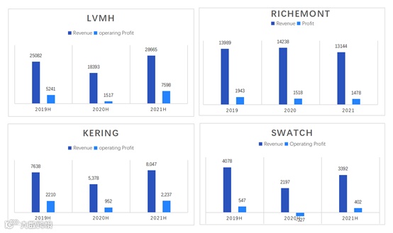 奢侈品集团2019-2021上半年/全年营业收入与利润情况
