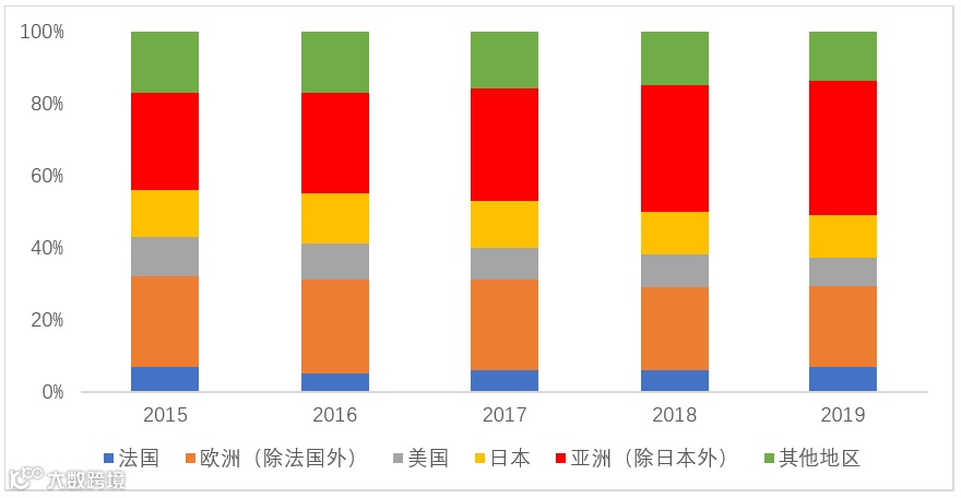 从各地区收入占比来看,欧洲、美国、其他地区的收入占比均呈现下滑态势,法国和日本的收入占比基本稳定,略有下滑,亚洲除日本外地区的收入占比逐年提升。
