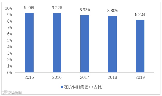 LVMH集团珠宝及钟表业务收入及在集团中收入占比