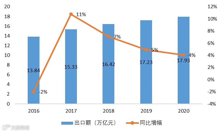 虽然人民币升值明显,全年对美元汇率涨幅为7%,但并未对出口造成较强影响,由于海外工厂生产停滞,外贸企业抓住机遇,疫情相关制造业总体出口量上升,全年货物出口总额约18万亿元,同比增长4%。