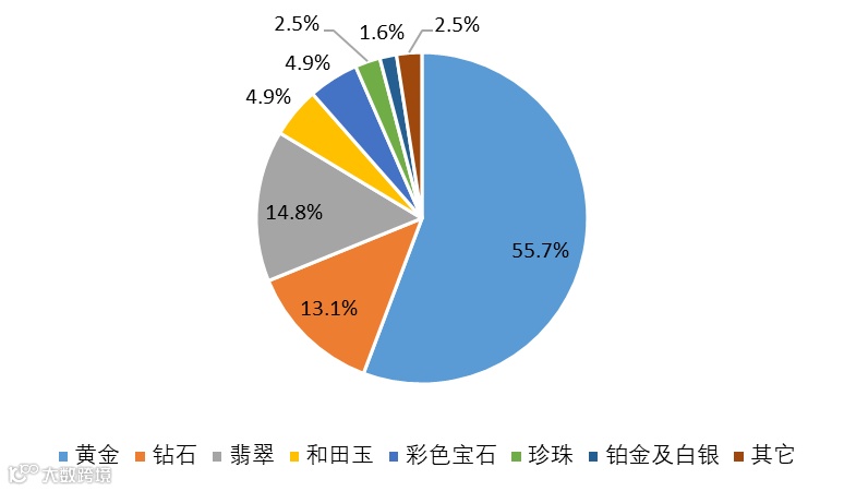 如上图所示,黄金产品在我国珠宝产业中仍占据较大份额,翡翠玉石产品、钻石产品位列其后,这三类产品共占据我国珠宝市场整体份额80%以上。
