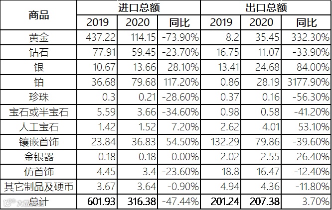 表. 2020年珠宝相关产品进出口总额(单位:亿美元)
