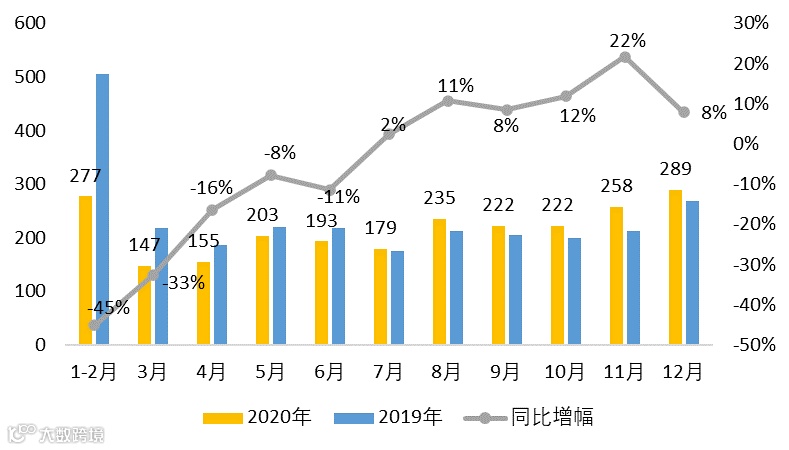 2019-2020年限额以上单位金银珠宝零售额月度对比