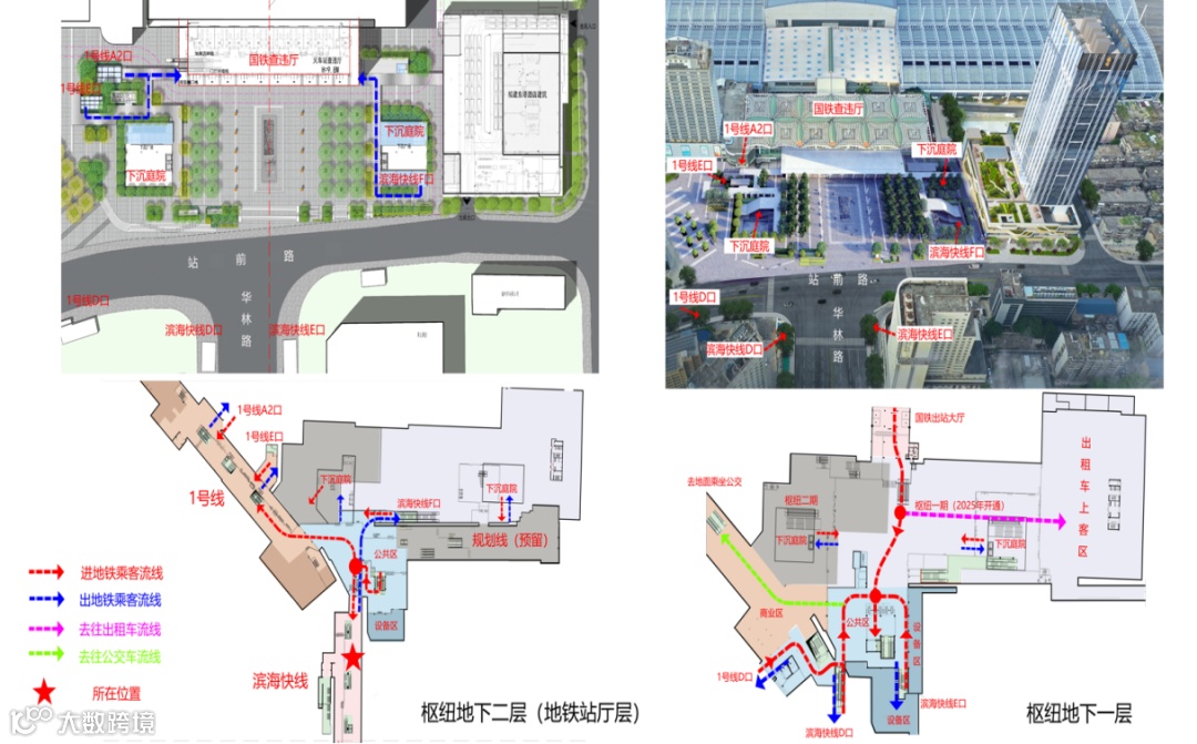 创新枢纽一体化设计,打造火车站、帝封江、滨海CBD、机场四大综合交通枢纽,预留安检互信,践行“无缝换乘”理念。