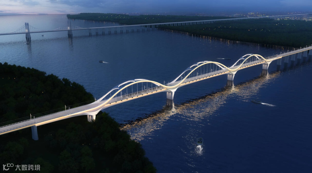 乌龙江特大桥国内首次采用横梁联合钢拱的组合形式,凸显展翅羽翼,犹如海上丝绸飘带,三联拱曲线形似“闽江潮涌”的波浪,寓意福州经济和社会发展不断进步,犹如一波接波的浪潮,连绵不断。