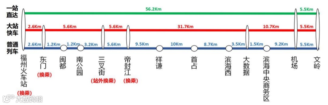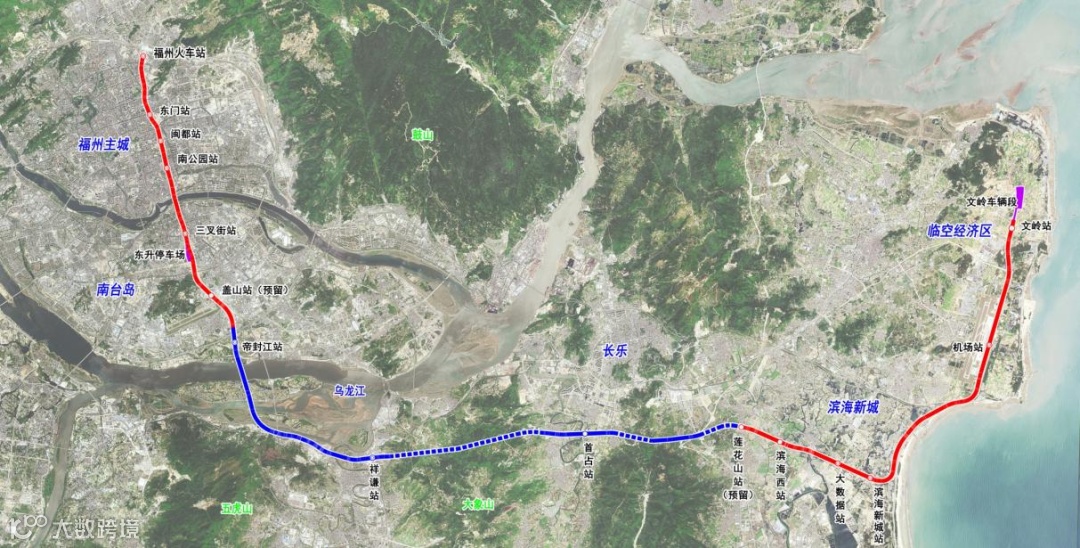 线路与多条地铁、国铁、空港高效便捷衔接,福州火车站、东门站、帝封江站与地铁1、4、5号线换乘;机场站从B口出站经风雨连廊步行一两分钟,即可直达长乐国际机场T1航站楼12号门;福州火车站F口出站后穿过连廊,步行约100米即可到达国铁福州火车站南广场进站口。