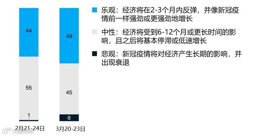 麦肯锡分别于2月下旬和3月下旬进行了两次消费者调查,调查样本约为2500人。如上图所示,相较2月份,3月的调查结果显示更多的人对未来经济走势表示乐观,认为经济将在疫情爆发后两三个月内恢复常态,其中高级别城市的受访者乐观比例更高,约为55%,而低级别城市的乐观者比例较低,约为40%。