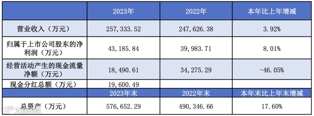 回顾2023年,公司立足主业,聚焦战略目标,加快发展步伐,经营业绩稳中向好:2023年度实现营业收入25.73亿元,较上年同期增长3.92%;利润总额5.01亿元,首次突破5亿元,较上年同期增长9.15%;净利润4.39亿元,较上年同期增长8.21%;向全体股东每10股派发现金红利4.90元(含税),共派发现金红利1.96亿元,较上年同期增长8.89%。