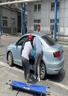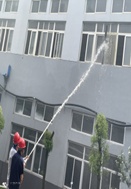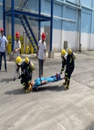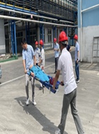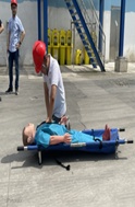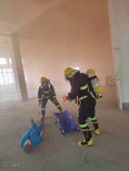 演练模拟上班时间,成品仓库2F由于施工人员违规吸烟,丢弃烟头,导致废油着火,施工人员灭火不当,继而引燃旁边的废弃包装物,浓烟四起,施工人员(伤员)吸入浓烟晕倒。各组组长按照演练方案立即采取紧急处置行动。