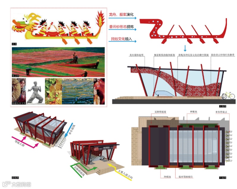 结合广州地铁出入口雨棚“飞顶”设计,顺德段出入口雨棚以“顺舟明德”为设计理念,整体外形设计由龙舟的原型简化提炼,工字钢组成的外部装饰框架代表拼搏向前的船桨,中间红色镂空铝板,既是龙舟的主要船体,也象征一条飘舞的香云纱色带,镂空图案来源于顺德独有的多元文化的抽象图案,寓意地铁像一艘拼搏向前的龙舟,带领顺德人民及本地的民俗文化一路向前开进。