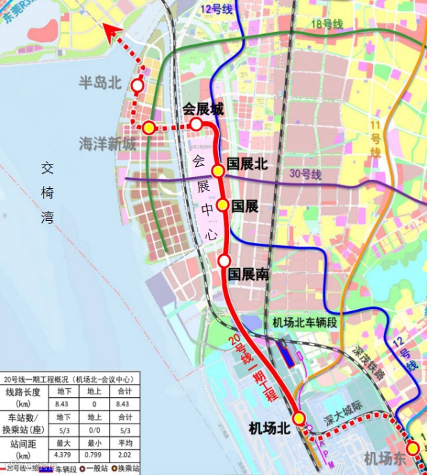 作为全球最大会展中心的市政配套项目,深圳地铁20号线是刷新地铁建设速度的一项伟大工程,它起始于深圳宝安国际机场T4航站楼机场北站,终于会展城站,是串联深港科技创新合作区、深圳核心、大空港、东莞滨海湾,实现粤港澳大湾区东岸发展轴的快速连通。