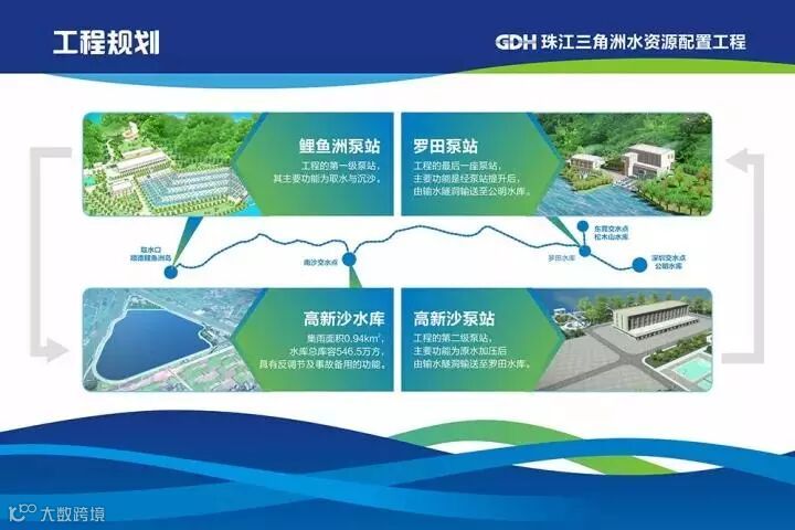 珠江三角洲水资源配置工程从西江水系向珠江三角洲东部地区引水,解决城市生活生产缺水问题,提高供水保证程度。工程建成后,多年平均供水量17.08亿立方 米,其中南沙区5.31亿立方米,东莞市3.30亿立方米,深圳市8.47亿立方米。工程同时为香港特别行政区、番禺区、顺德区等地提供应急备用供水条 件。该工程由一条干线、两条分干线,一条支线,3座泵站和1座新建调节水库组成。工程从西江鲤鱼洲取水,经鲤鱼洲、高新沙、罗田3级泵站加压,输水至南沙区的高 新沙水库、东莞市松木山水库和深圳市公明水库。工程设计引水流量80立方米每秒,输水线路全长113.1公里,其中干线长90.3公里,东莞分干线长 3.5公里,深圳分干线长11.9公里。新建高新沙水库总库容546.5万立方米。工期暂定60个月。