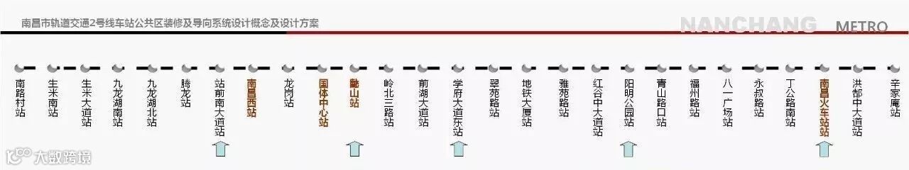 车站装饰装修融入地域文化。在南昌2号线的设计中,根据线网设计单位的研究成果进行细致的分析与研究。在设计中入以色彩区分线路的概念,将色彩标识线路的策略确实贯彻到每一个细节中,在色彩的选择上我们通过对南昌以及整个江西的地域文化的整理和研究,从各条线路周边地域周边的人文,乡俗,自然等因素中提取最能体现其特点的色彩作为主导色,并根据配色原则,以合理的协调色比例作为补充。南昌2号线以黄色作为主导色彩体现南昌的传统文化。