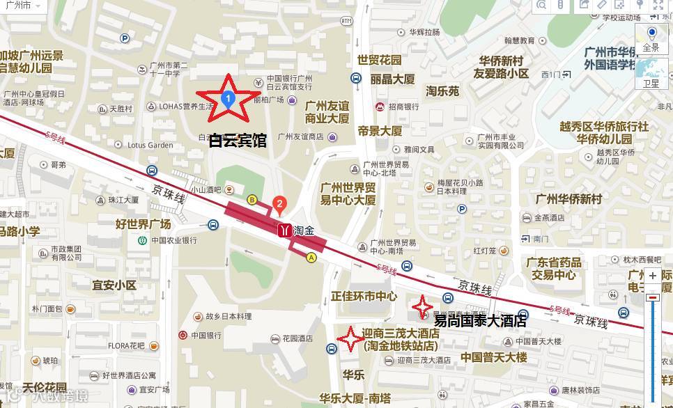 2.广州火车南站:距离宾馆23.5公里,乘坐出租车约40分钟64元;或乘坐地铁2号线到火车站换乘5号线到淘金站B出口,宾馆位于地铁上盖。