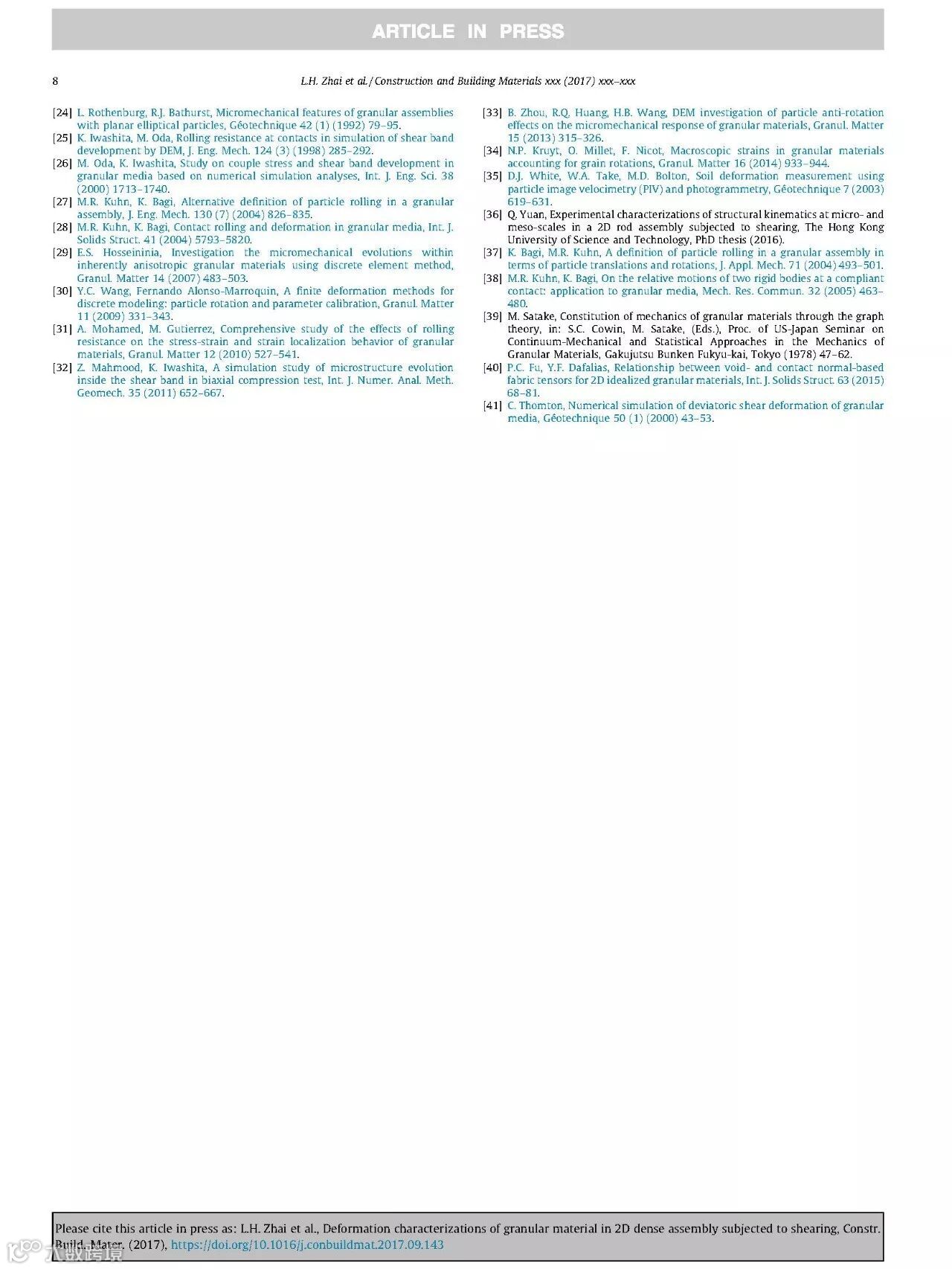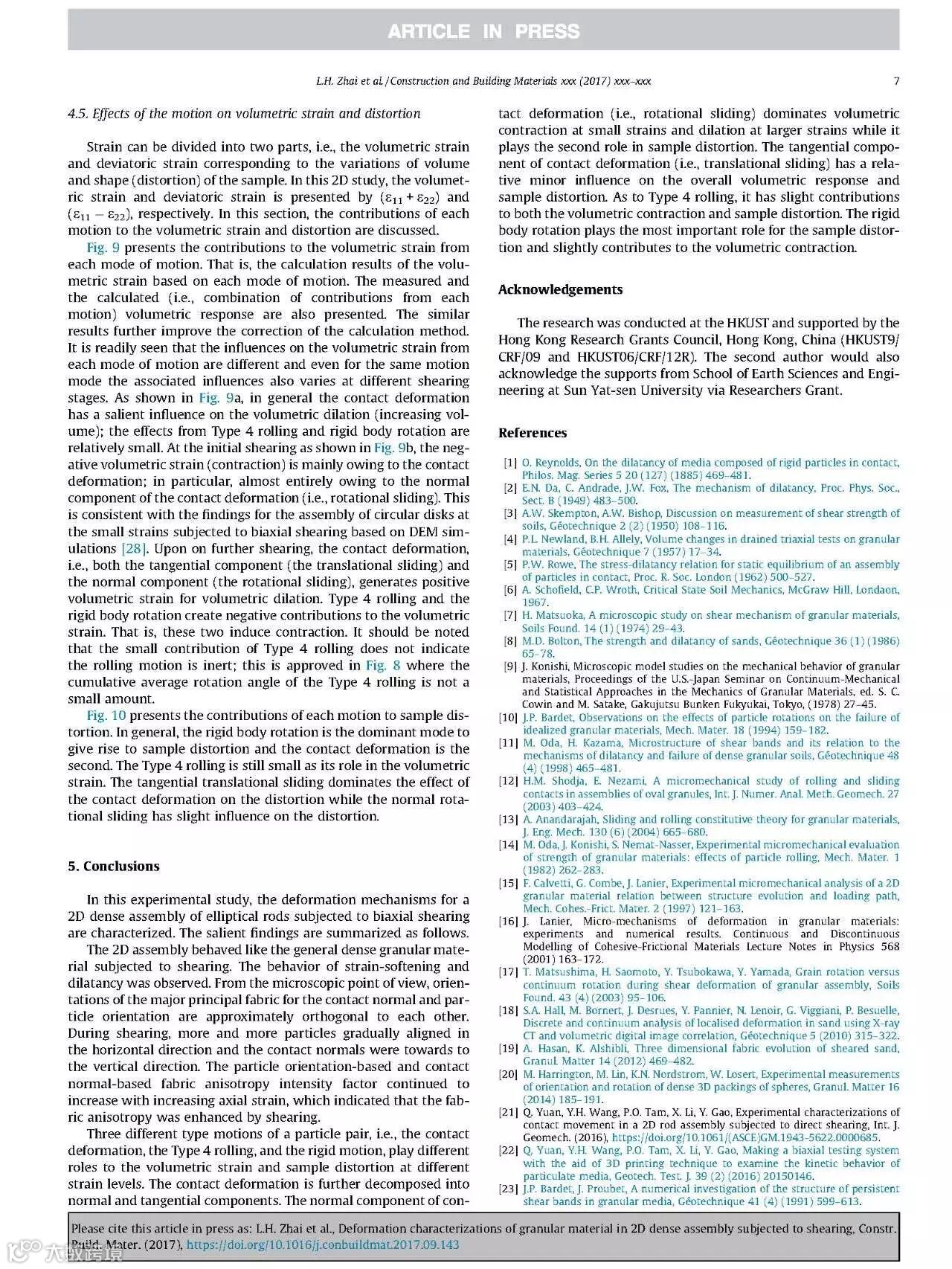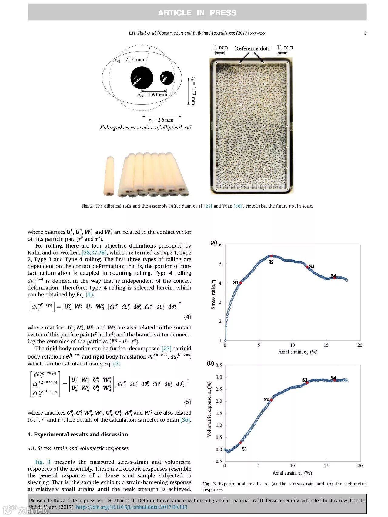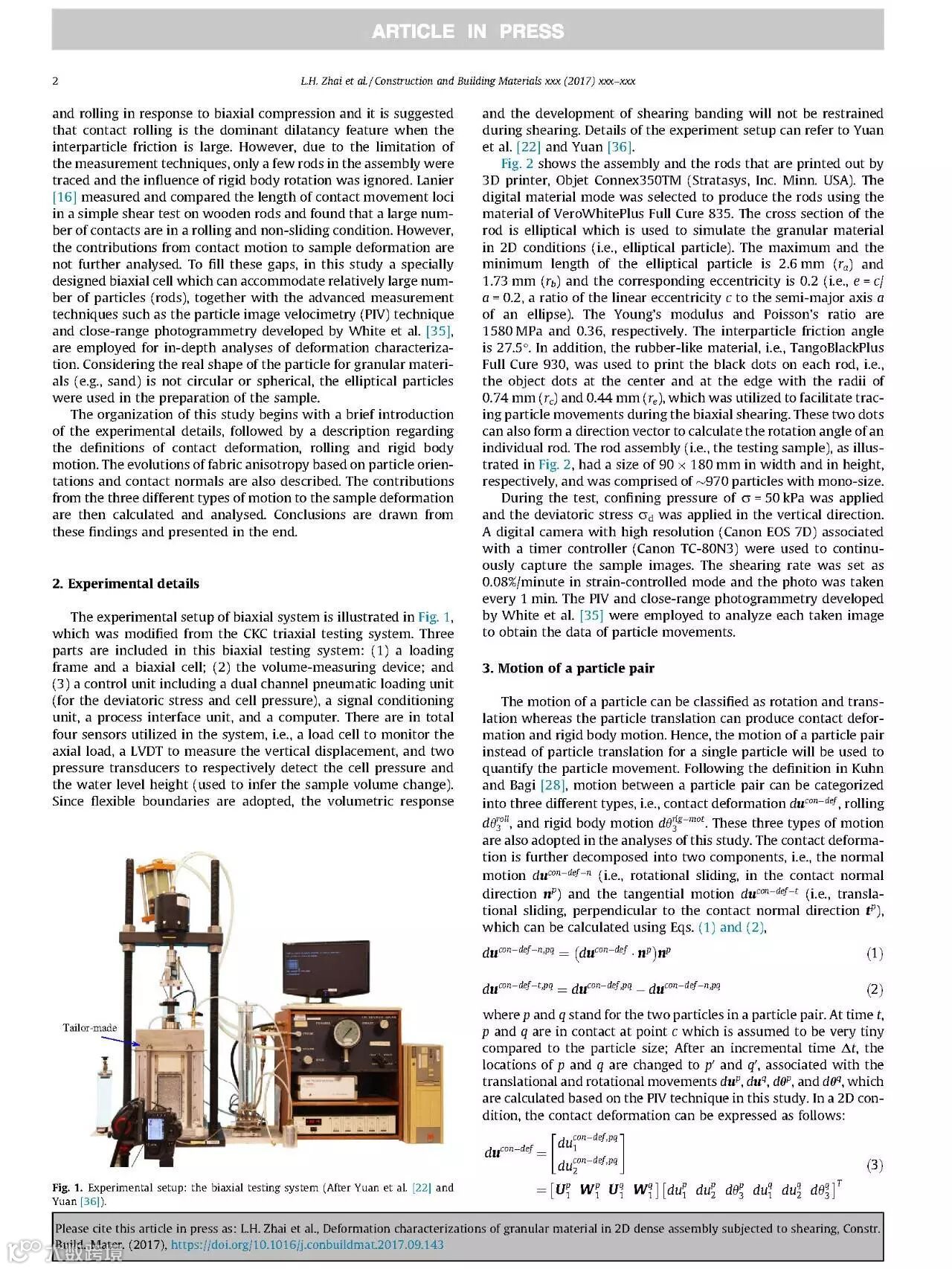 近日,由我院翟利华、史海欧、袁泉等合著的英文学术论文《Deformation characterizations of granular material in 2D dense assembly subjected to shearing》被英国著名SCI学术期刊《Construction and Building Materials》录用并已于网络刊登,印刷版正在排期出版中。该期刊近两年的影响因子IF为3.169,位于中科院JCR分区表中的二区,主要收录国际上关于工程与材料、建筑环境、结构工程等领域内的高水平学术论文。