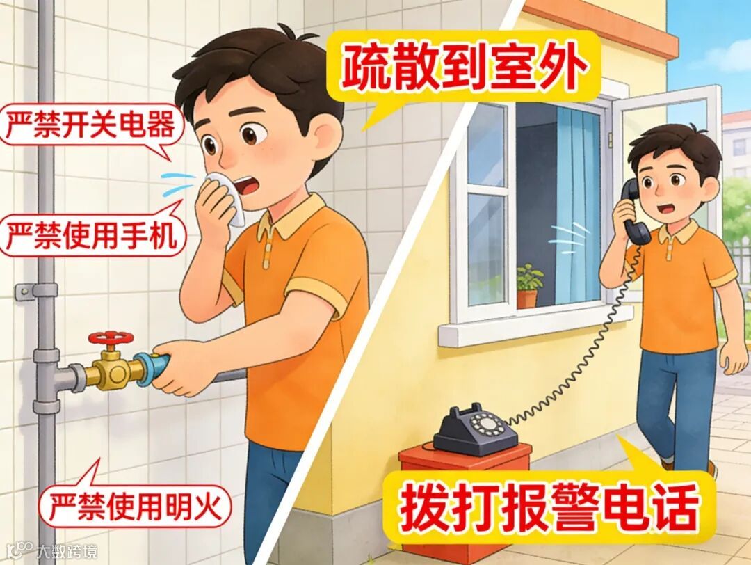 应迅速打开所有门窗通风稀释燃气,随即疏散家人到室外安全地带,拨打燃气公司应急电话或 119 报警,切勿在室内打电话或自行检修。