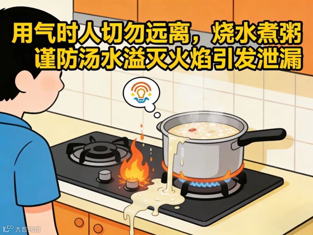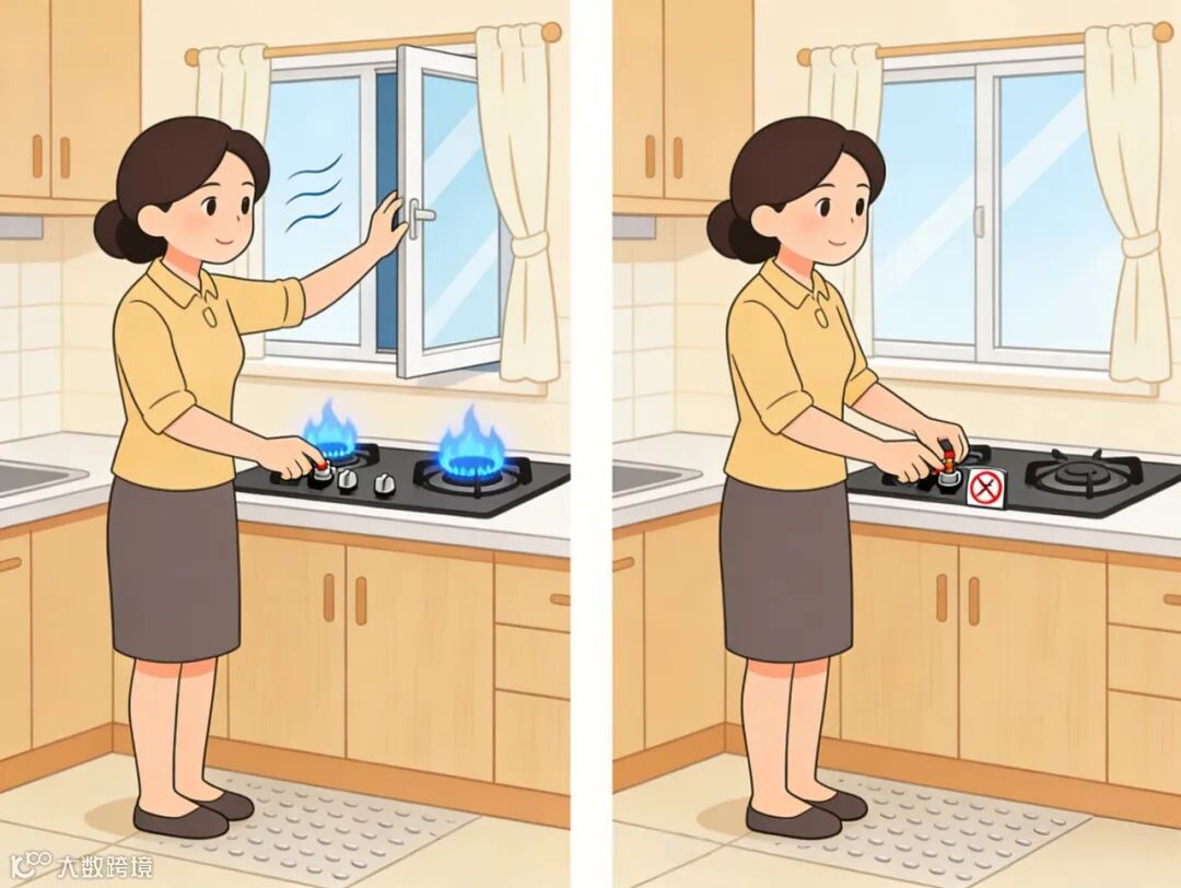 用气时人切勿远离,烧水煮粥谨防汤水溢灭火焰引发泄漏。使用燃气具需轻开窗户或开启排风扇,保证空气流通,杜绝完全密闭门窗。使用完毕后,及时关闭灶具开关和灶前阀门,睡前或外出务必关闭燃气总阀门;点火前先通风,停用时先关燃气阀再关灶具开关。
