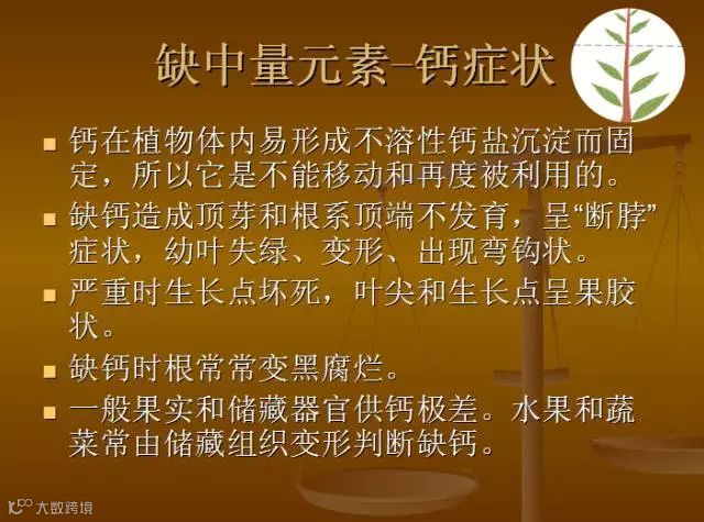 植物缺钙症状:顶芽、侧芽、根尖等分生组织易腐烂死亡,叶尖弯钩状,并相互粘连,干烧心、筋腐、脐腐等。