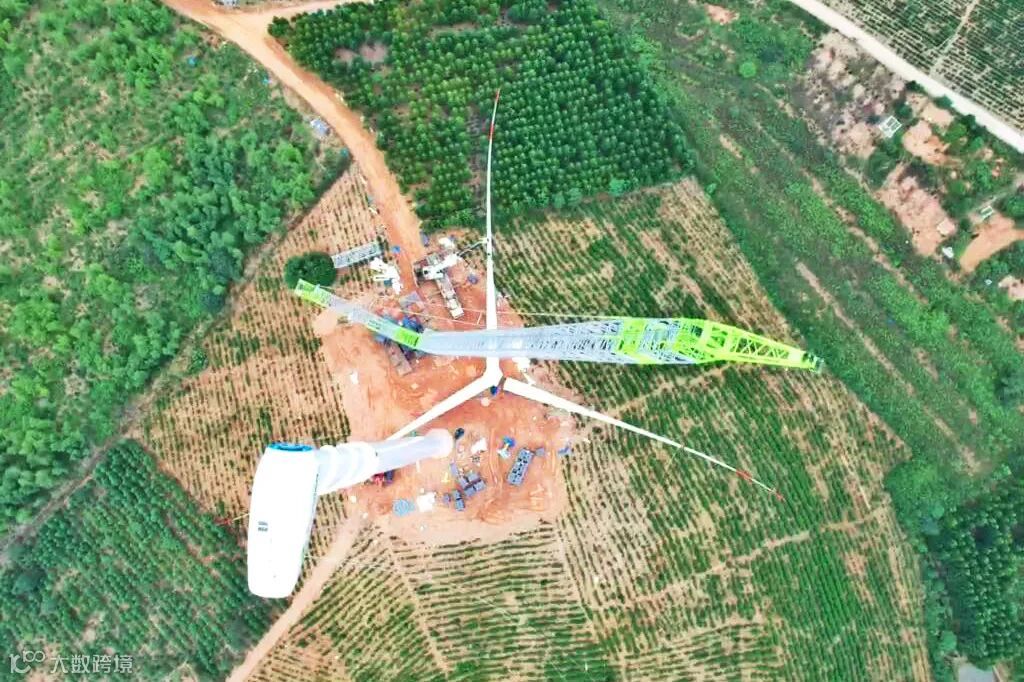 本次麻姑山风电场首台风机的吊装,采用的是叶轮组队吊装方式;先把叶片和轮毂在作业平台上组装好,然后再一起吊装。