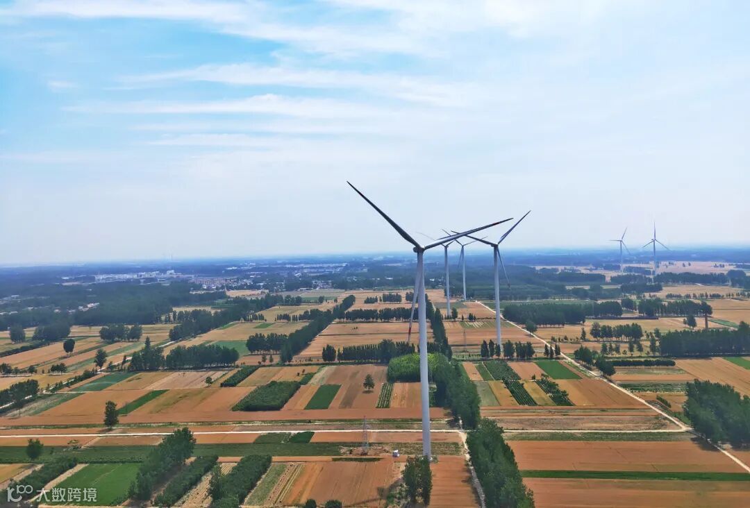 在菏泽沿黄河区域,迎风傲立的风机与丰收的田野相映成辉,与美丽的大自然和谐共处。