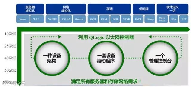 根据介绍,在以太网卡市场上,除了Intel一枝独秀之外,惟有QLogic的市场在不断扩大,从2013年市场占比的7%增长到10%,其他友商市场份额均不同程度的衰减。究其原因,江博翰表示,从10G、25G、40G、50G到100G,QLogic凭借一种架构、一套驱动程序,一个管理控制台,为服务器虚拟化、网络虚拟化、存储、软件定义提供了低时延的基础支撑。