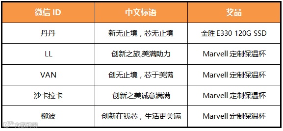 请中文标语征集活动获奖的小伙伴将你的收件地址发送给小美,我们将及时为您寄去奖品,请您保持电话通畅。如有疑问,可以留言给我们,我们将在第一时间答复您,感谢支持。(活动最后解释权归Marvell所有)