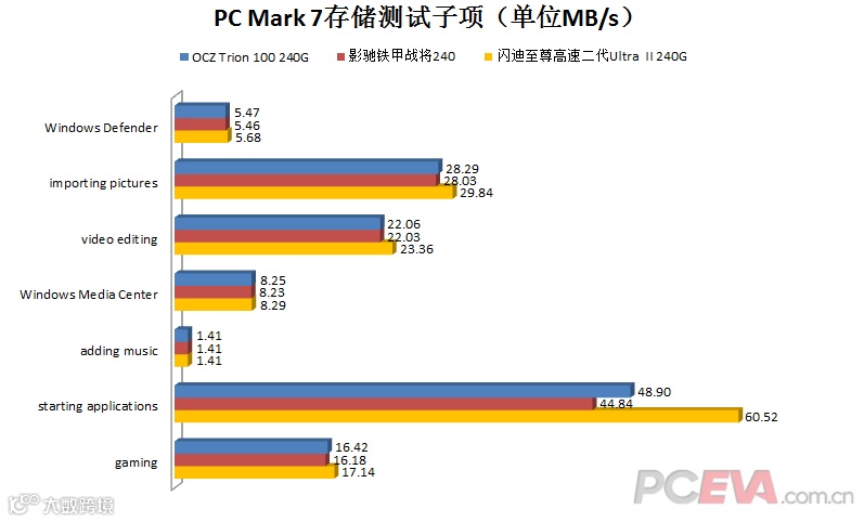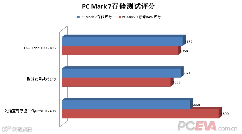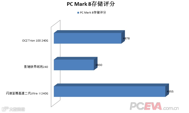OCZ Trion 100 240G与影驰铁甲战将240的PC Mark 8存储测试评分属于典型的入门级表现,而闪迪至尊高速二代Ultra II 240G则已经能够接近主流级SSD产品。