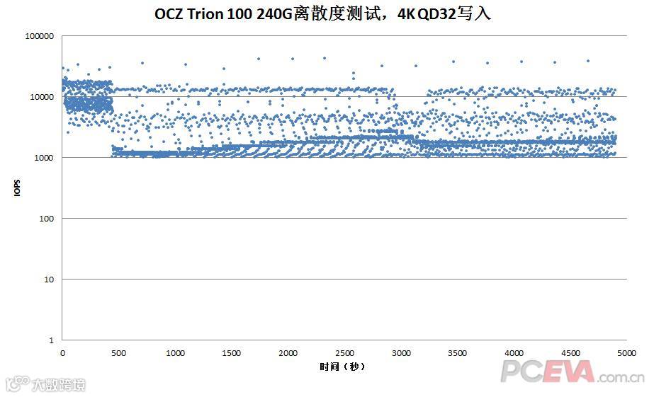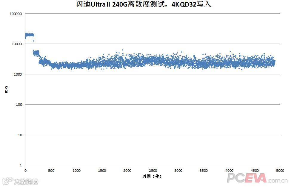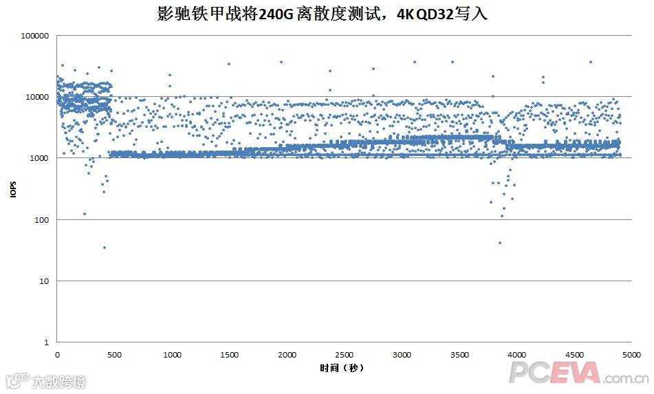 使用IOMeter进行4KB QD32 随机写入离散度测试,时间5000秒。测试方法是全盘快速格式化后用Iometer 1.1 (Pseudo随机数据模型)填充满全盘LBA,设置4KB QD32 , 4KB分区对齐,随机写入100%,1秒记录一次采样,5000个采样一共5000秒。离散测试主要是用于给需要在持续高负载且对写入延迟需求很苛刻的使用环境下作参考之用。