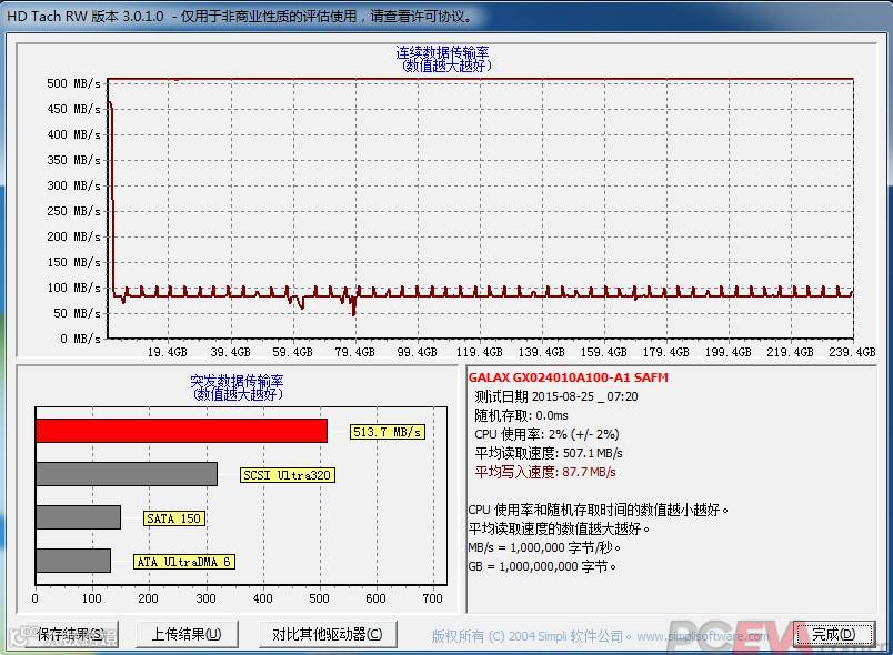 从PC Mark 8存储测试各子项成绩来看,闪迪至尊高速二代Ultra II 240G依旧在绝大多数项目中取得领先,不过各个SSD之间的成绩并没有拉开太多,即便是最慢的盘在实际使用中也不会有明显需要等待的感觉。