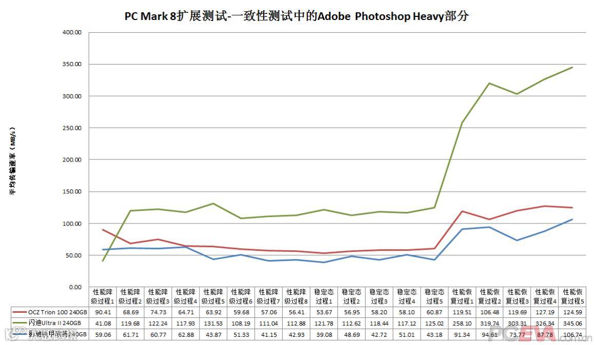 高负载写入压力并非TLC闪存SSD的设计使用条件,PC Mark 8扩展存储测试对于他们来说更像是一个稳定性考察项目。